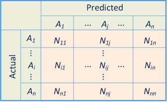 There are also confusion matrix for a multi-class classification task(Sammut, C. et al., 20112:), with the classes \(A_1\), \(A_2\), and \(A_n\). In the confusion matrix, \(N_{ij}\) represents the number of samples actually belonging to class \(A_i\) but classified as class \(A_j\).